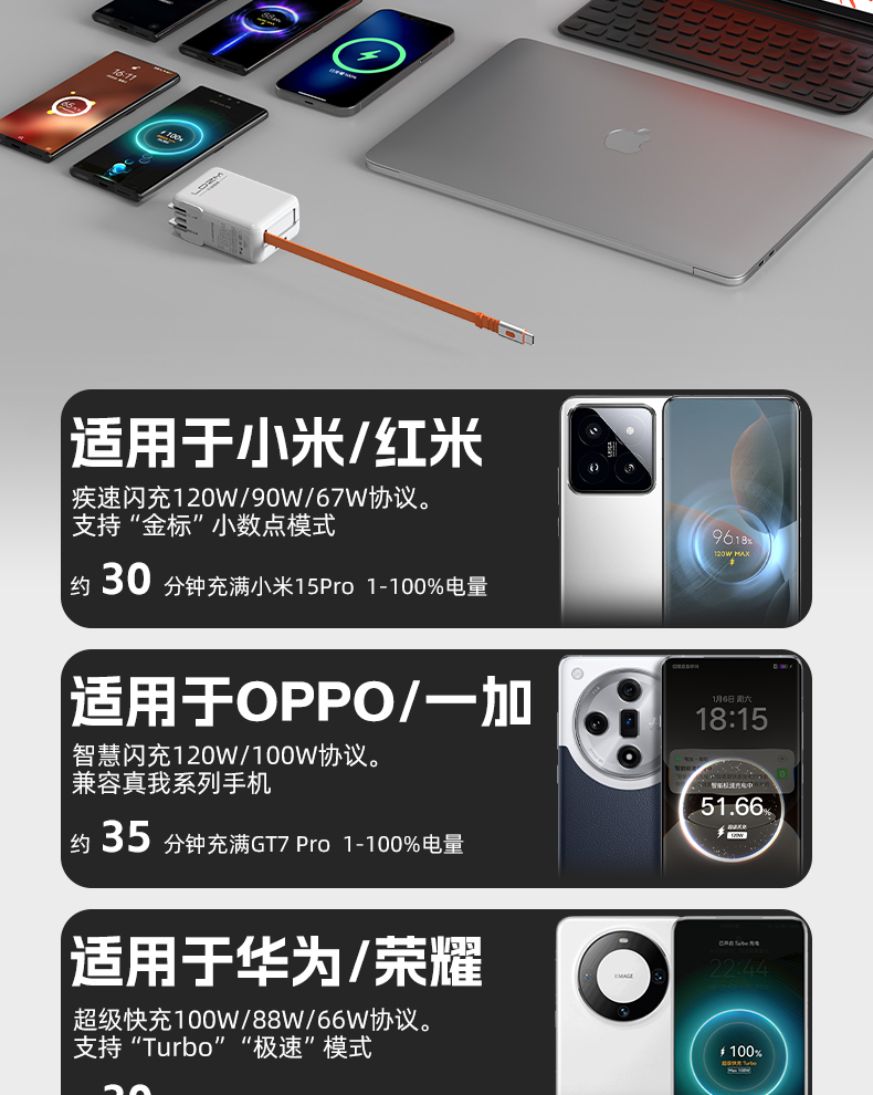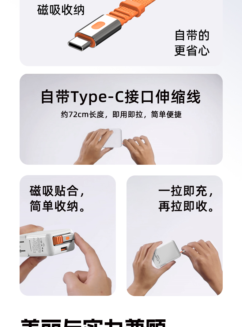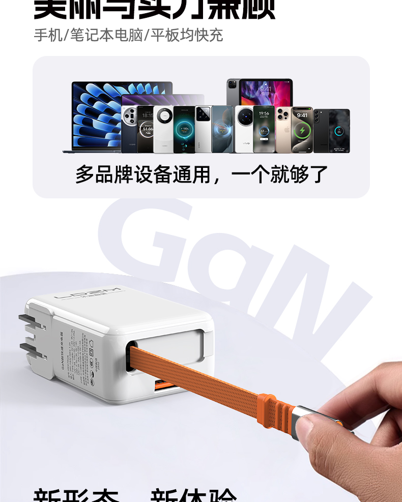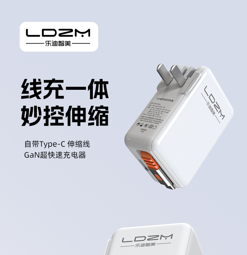 乐迪智美氮化镓充电器快充充电头适用华为小米vivo一加oppo三星iqoo荣耀苹果Type-c自带拉伸缩线PD笔记本电脑