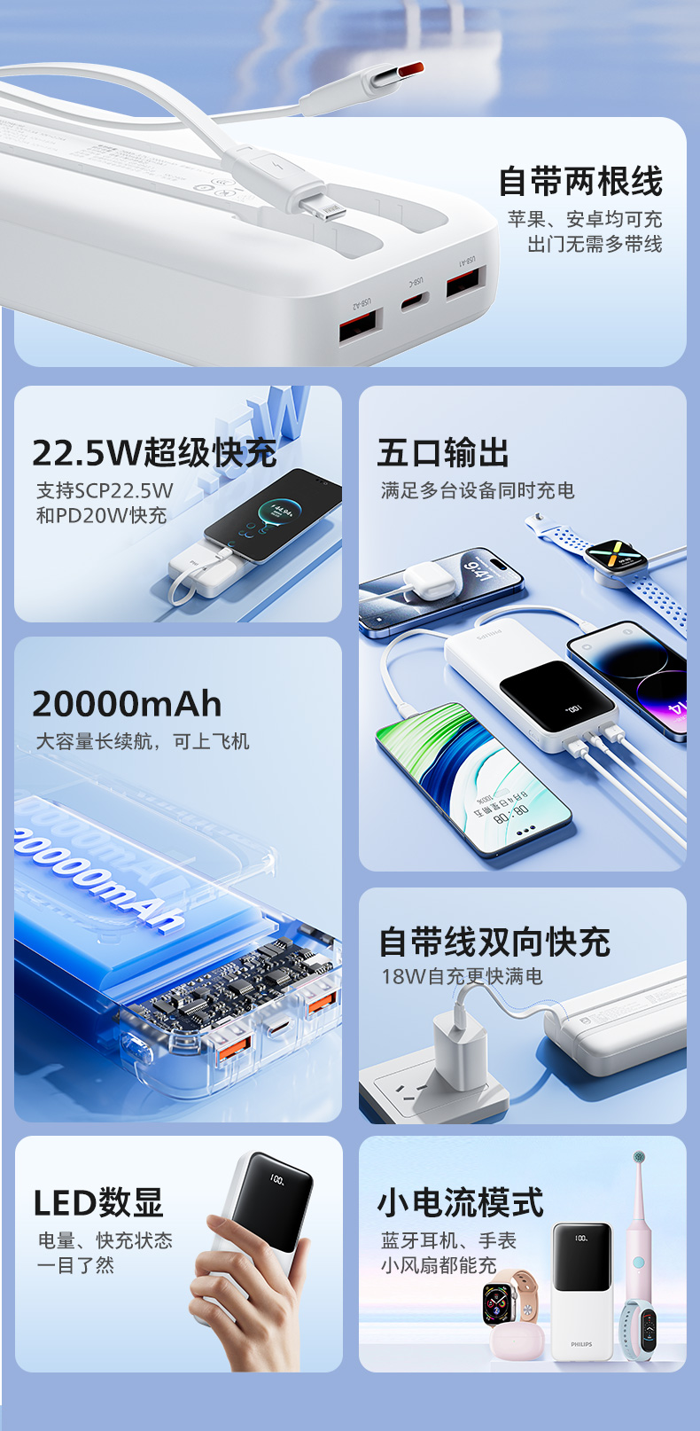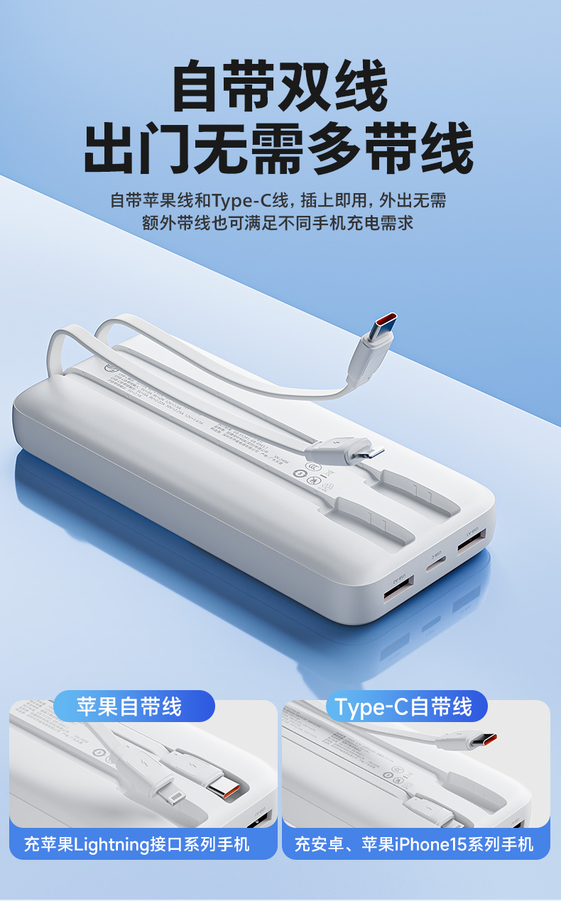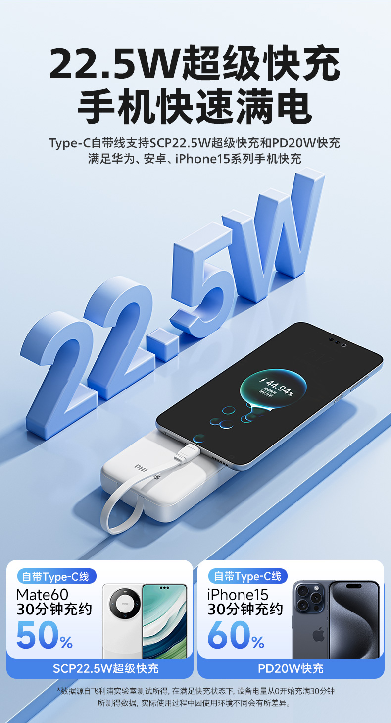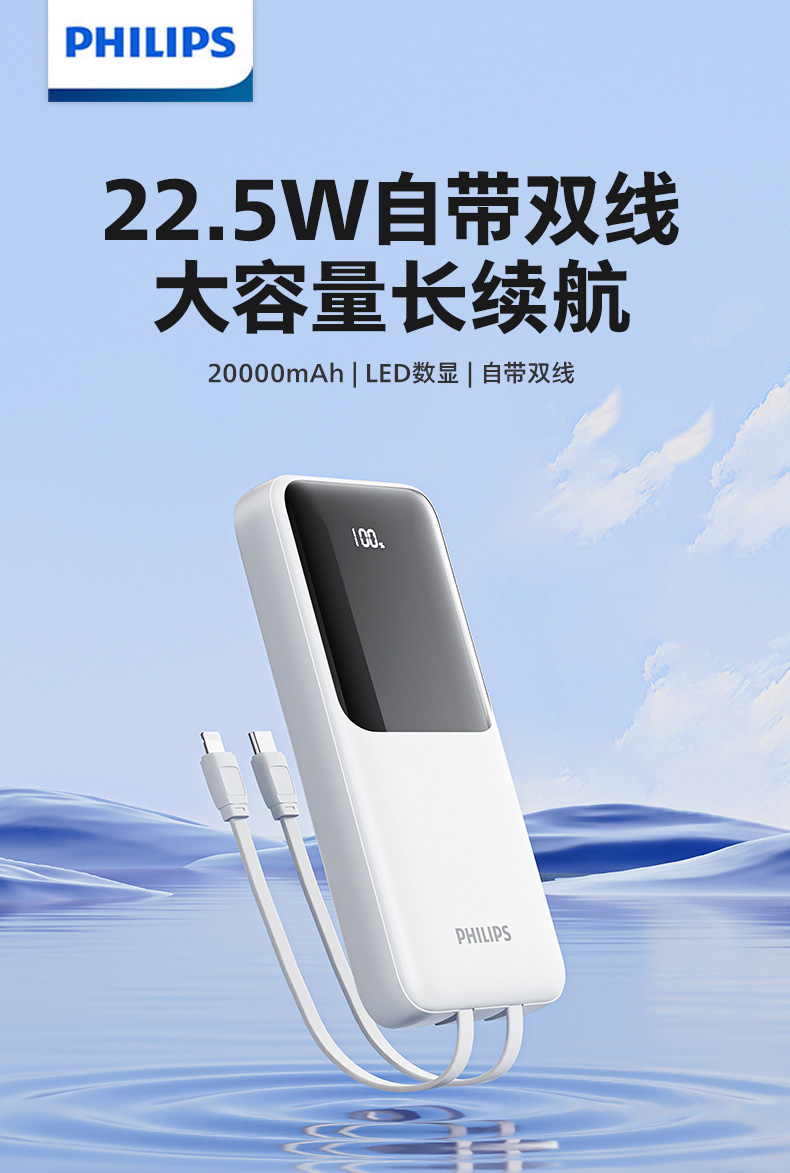 飞利浦2025新款充电宝快充大容量20000毫安自带线超薄小巧便携移动电源适用iphone16苹果15