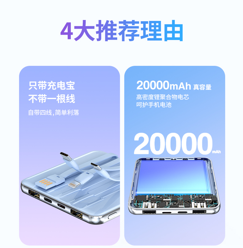 2025新款充电宝自带线20000毫安大容量22.5w快充适用小米华为苹果手机专用正品超薄小巧便携