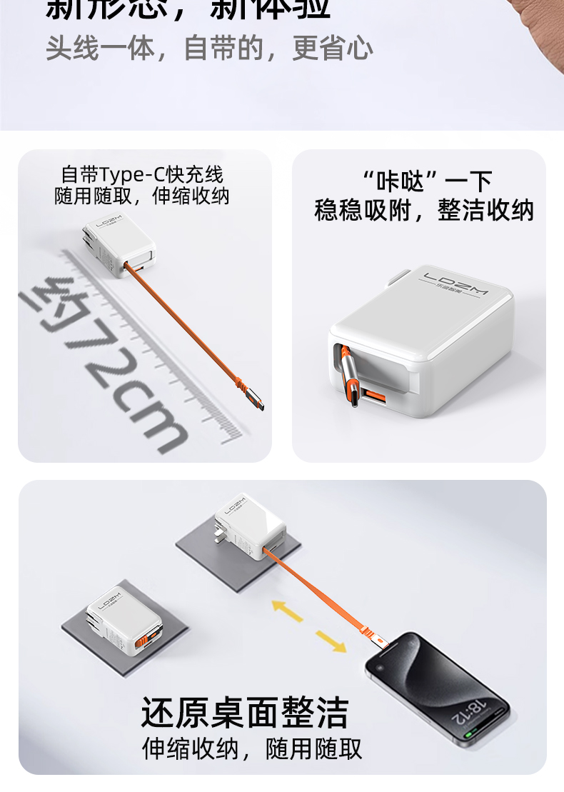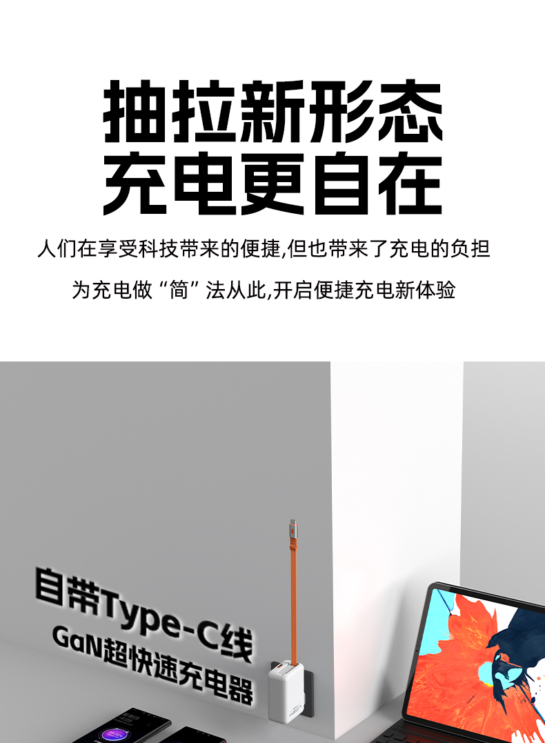 乐迪智美氮化镓充电器快充充电头适用华为小米vivo一加oppo三星iqoo荣耀苹果Type-c自带拉伸缩线PD笔记本电脑